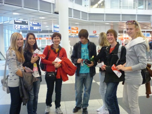 Blížil se den odjezdu, tedy neděle 14. 11. 2010 a naše pocity byly smíšené. Všichni se těšili, ale zároveň měli obavy z komunikace v angličtině. Sešli jsme se u vlakového nádraží v Táboře v 9:00 i s našimi učitelkami, p. uč. H. Průšovou a p. uč. A. Jandlovou. Z Prahy nám bohužel letadlo neletělo, a proto jsme vyrazili směrem k letišti v Mnichově. Na místo jsme dojeli asi za 4 hodiny. Letadlo do Alicante, města, kde se setkání konalo, letělo až v 17:20, tak jsme nechali odbavit zavazadla. Měli jsme dost času na to, abychom si prošli různé obchody, které se nacházely v areálu letiště. Většinu času jsme strávili čekáním na lavičkách, povídáním si a svačením. V době, kdy se už blížila 17. hodina, jsme se znovu všichni sešli a zamířili jsme k letištní kontrole. Potom nás čekal už jen nástup do letadla německé společnosti Airberlin.