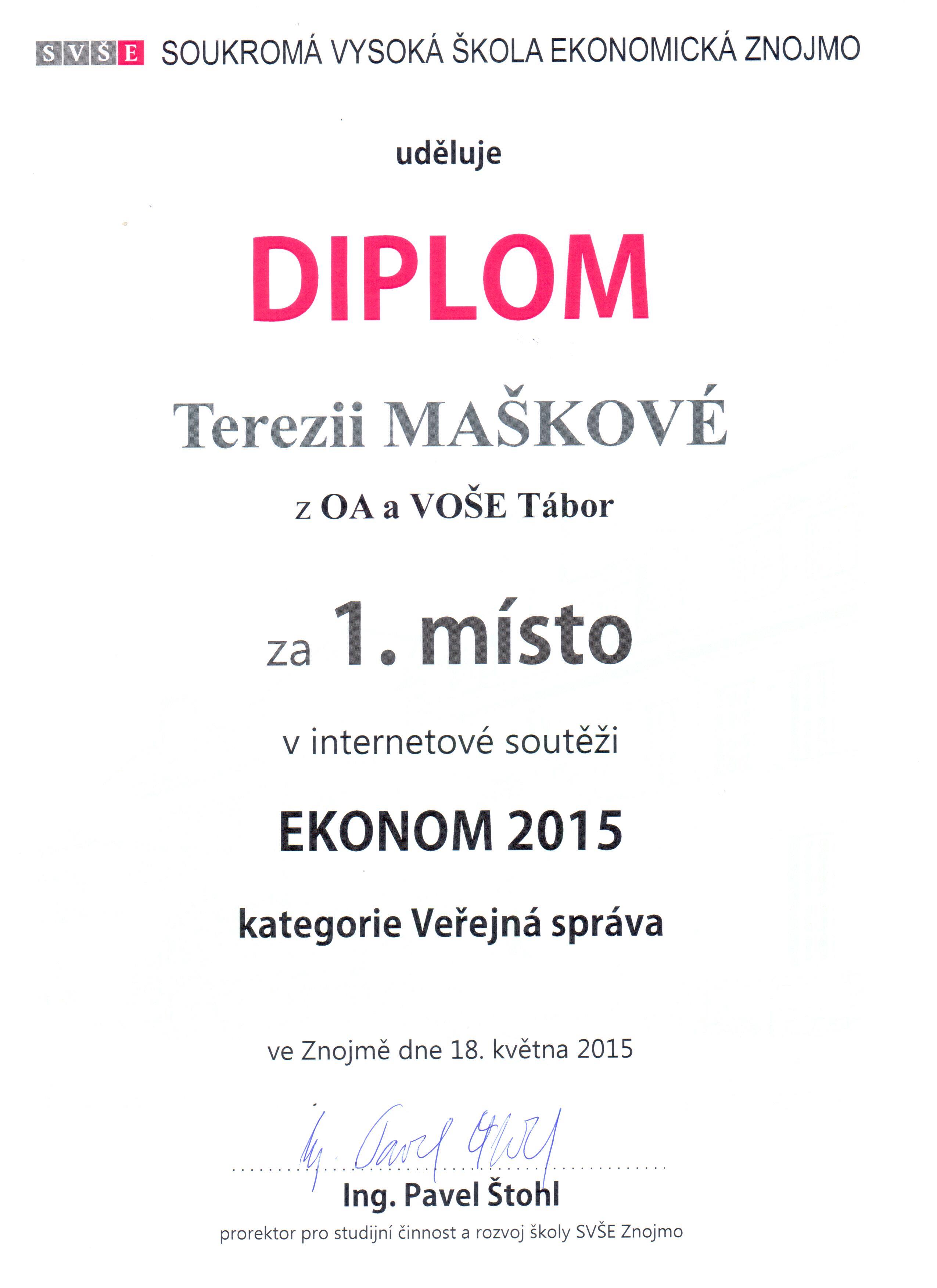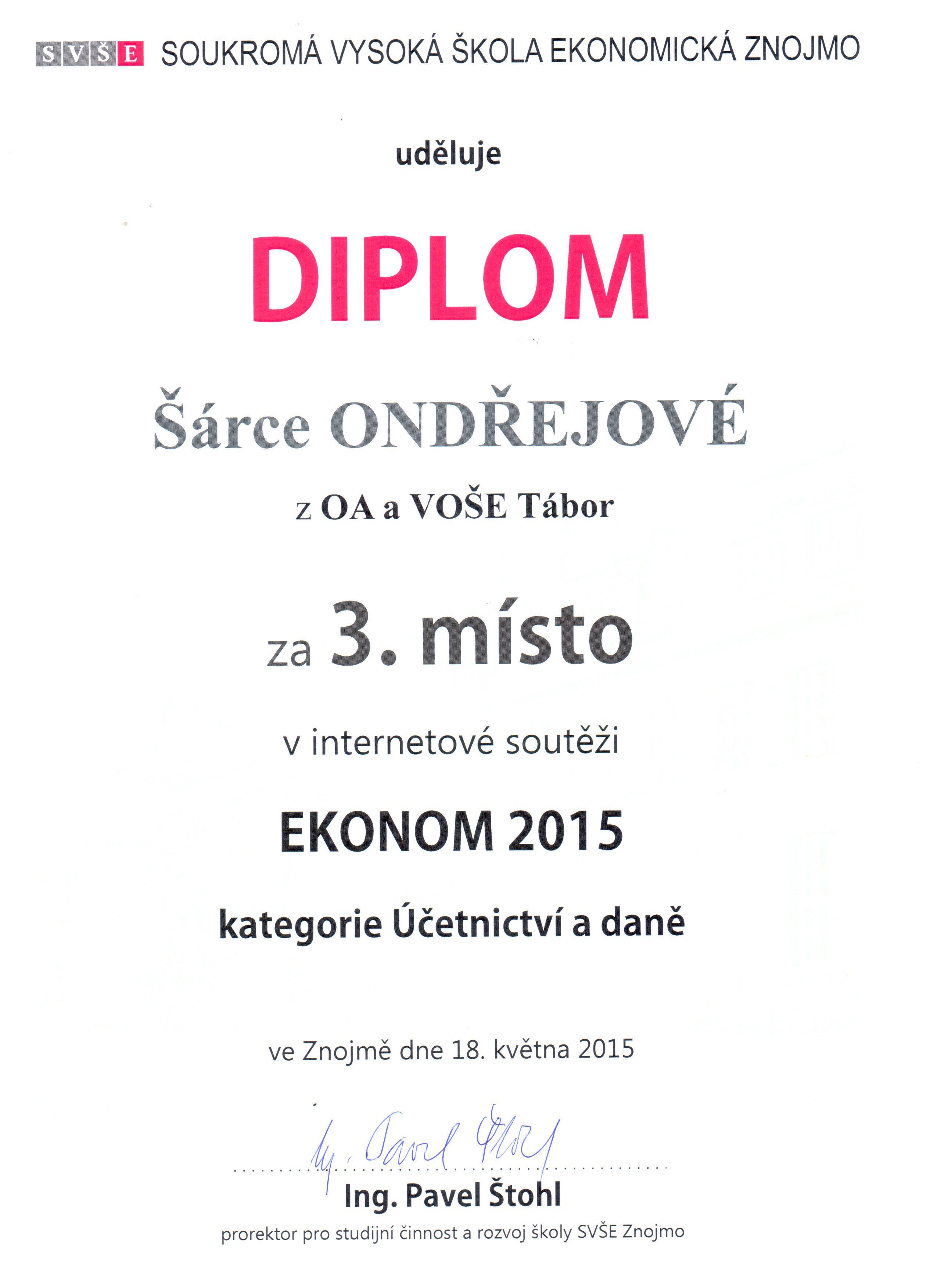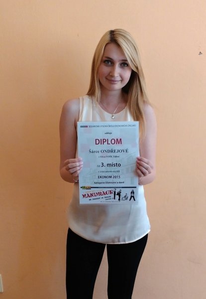 V oblasti Účetnictví a daně obsadila 3. místo Šárka Ondřejová, studentka 3. B, v oblasti Marketing a management se na 3. místě umístil Erik Burzala, student 3. A. V oblasti Veřejná správa získala 3. místo Barbora Jedličková, studentka 3. A. Všichni studenti získávají vstupenku na koncert Mandrage s možností ubytování ve Znojmě.