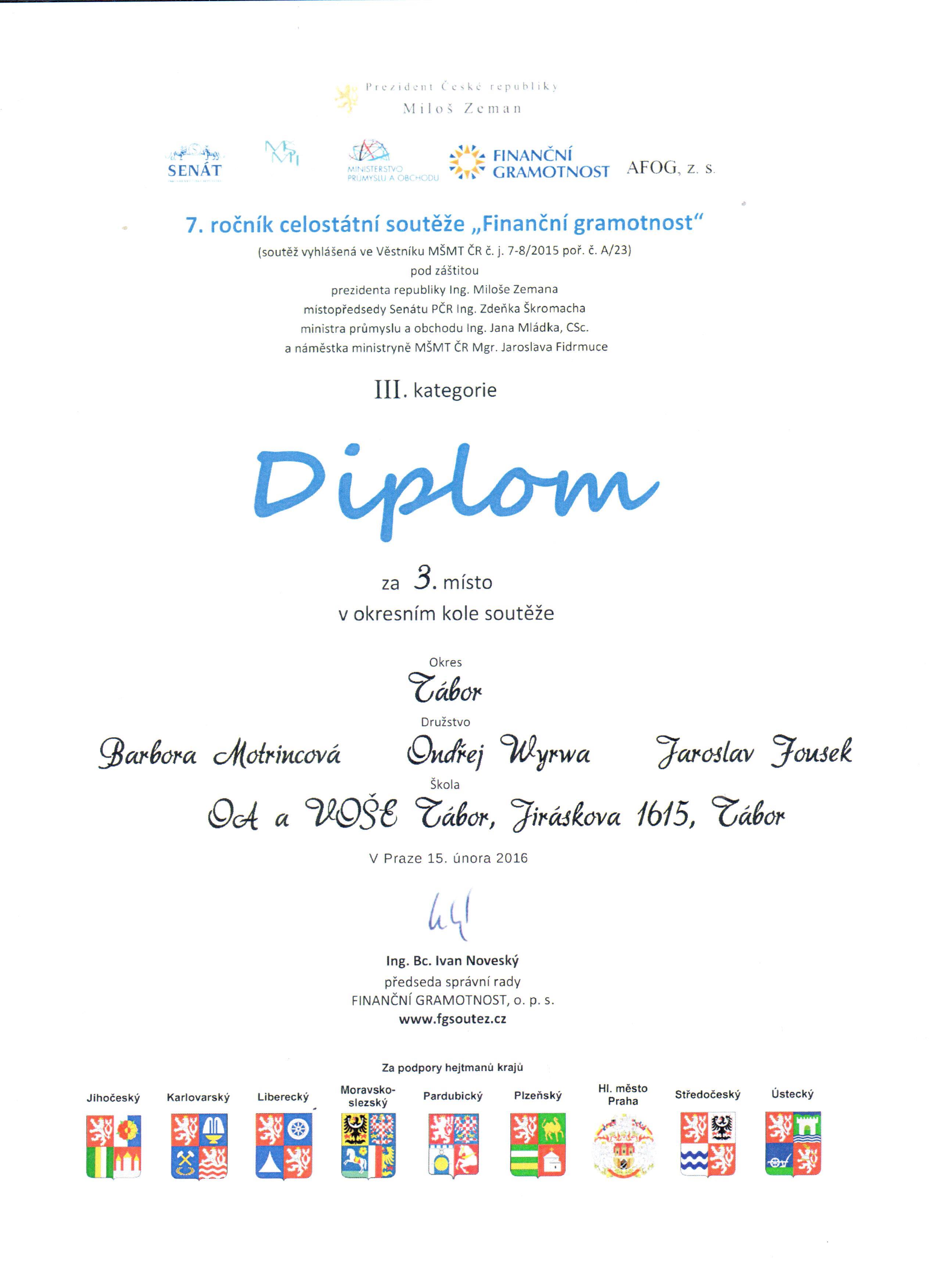 V únoru 2016 se uskutečnilo školní kolo 7. ročníku celostátní „Soutěže Finanční gramotnost“, která se koná pod záštitou náměstka ministryně MŠMT, ministra průmyslu a obchodu, guvernéra ČNB a místopředsedy Senátu PČR.